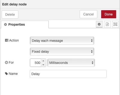 The delay node sets a delay for 500 miliseconds. This is necessary due to the latency needed for the lights to receive commands.
