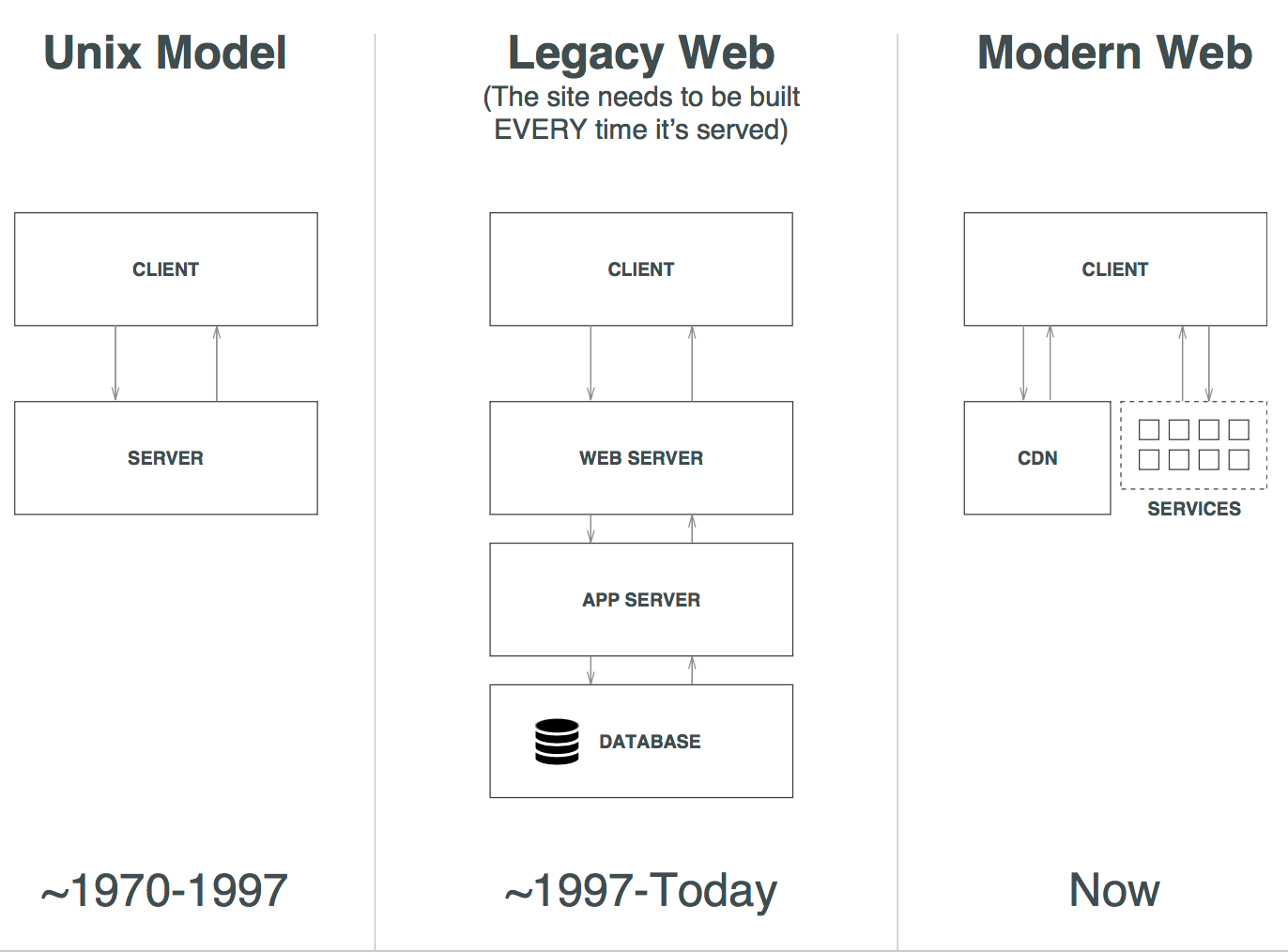 Without getting to much into details Netlify helps simplify the way clients communicate with the server to view a website. Looking at the image below the Legacy Web illustration shows how sites like Wordpress works. We have a server where the site is hosted and a database that the site is placing information into and reading from.